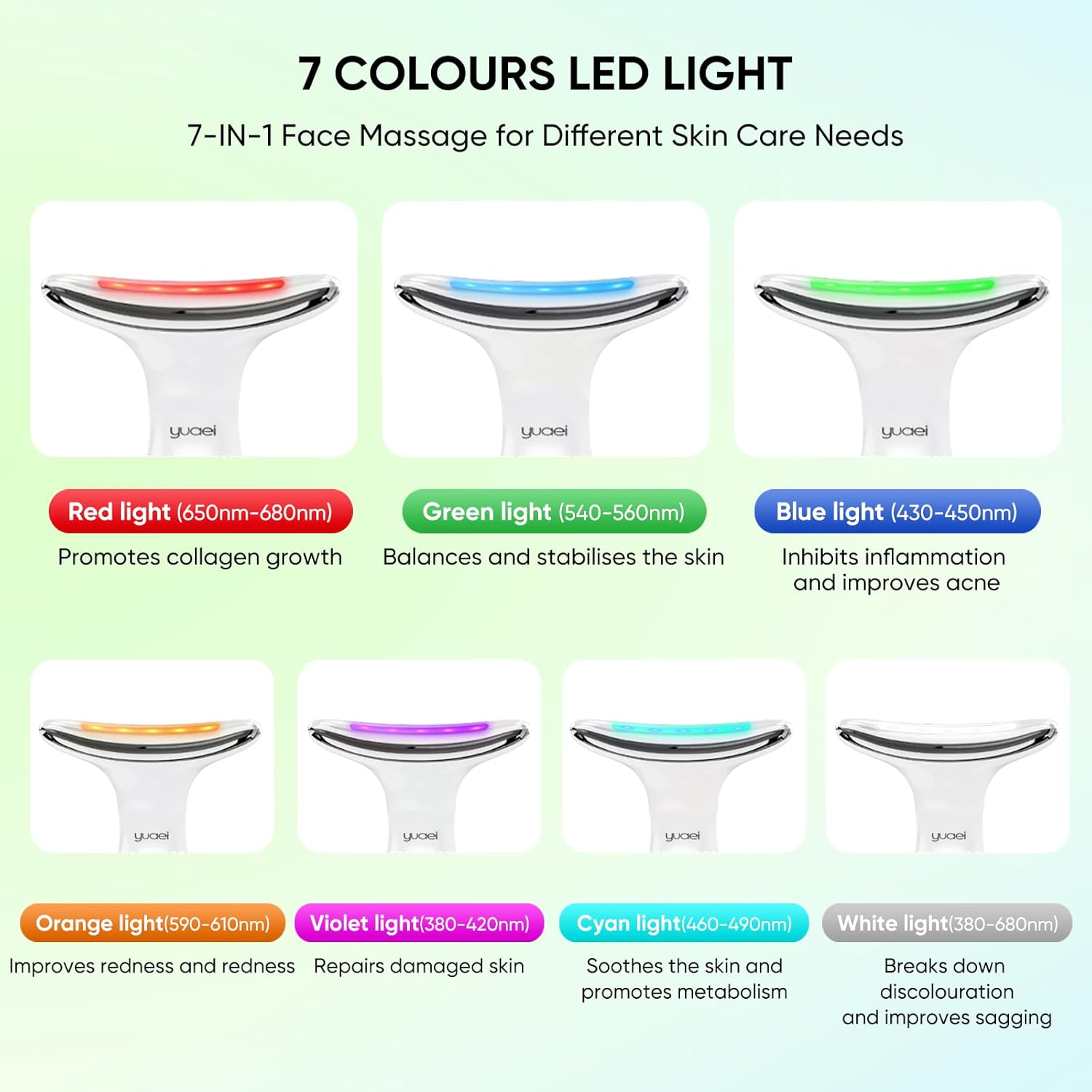 Product description:7 COLOUR LED LIGHTS: The beauty device features 7 LED light modes (380–680nm) for different skincare benefits. Red light supports skin firmness; green light helps balance skin tone; blue light reduces surface discomfort; orange light refreshes dull-looking skin; violet light aids skin recovery; cyan light promotes skin vitality; and white light improves overall tone and appearance.